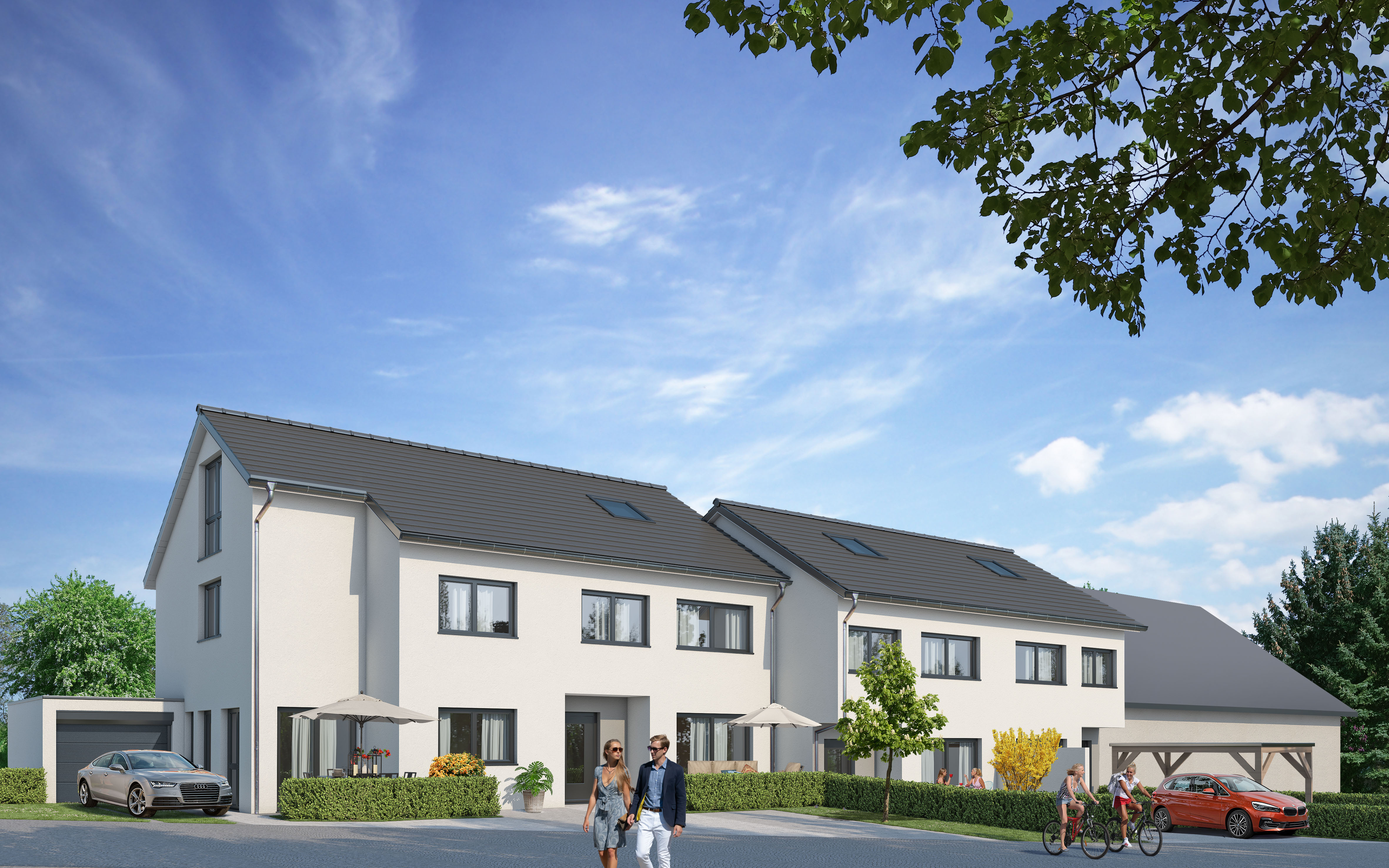 Hier entstehen vier Reihenhäuser in einer modernen und effizienten Bauweise. Die Häuser werden in Holzständerbauweise erbaut, mit einem effizienten Heizungssystem und einer Be- und Entlüftungsanlage mit Wärmerückgewinnung ausgestattet. Die Räumlichkeiten sind wie folgt aufgeteilt: Im Erdgeschoss erwartet Sie ein großzügiger Wohnbereich, eine offene Küche mit Essbereich, ein Hauswirtschaftsraum und ein Gäste-WC. Im Obergeschoss befinden sich das Schlafzimmer, ein Kinderzimmer und ein großzügiges Tageslichtbad mit Wanne und Dusche. Das Dachgeschoss bietet Platz für zwei weitere tolle Zimmer, der Ausbau ist optional möglich und individuell planbar. Zum Verweilen und Entspannen bieten die Terrasse und der Garten schöne Möglichkeiten. Vor dem Haus gibt es zwei Außenstellplätze.